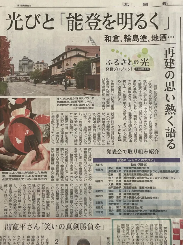 北國新聞社など西日本の地方紙6紙が地域の魅力を発掘、発信する「ふるさとの光発見プロジェクト」第6弾として、輪島塗復興協議会の取り組みが選出されました。理事長大工治彦のコメントも紹介をされています。